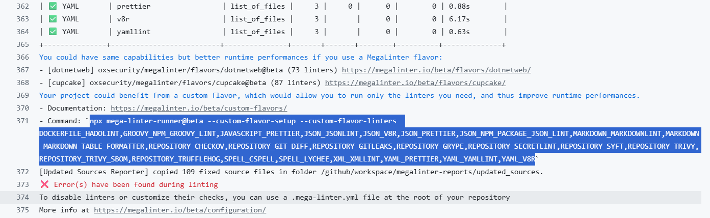 You can also send the list of linters as parameters, available from the logs of any official MegaLinter flavor (if you don't see it, make sure FLAVOR_SUGGESTIONS: true is defined in your .mega-linter.yml config file).