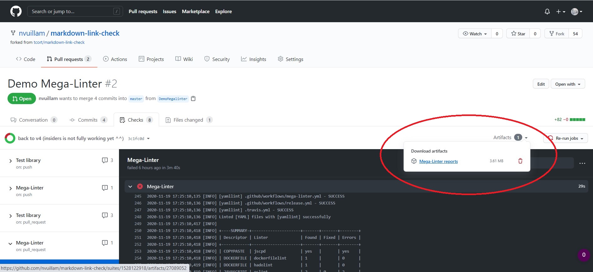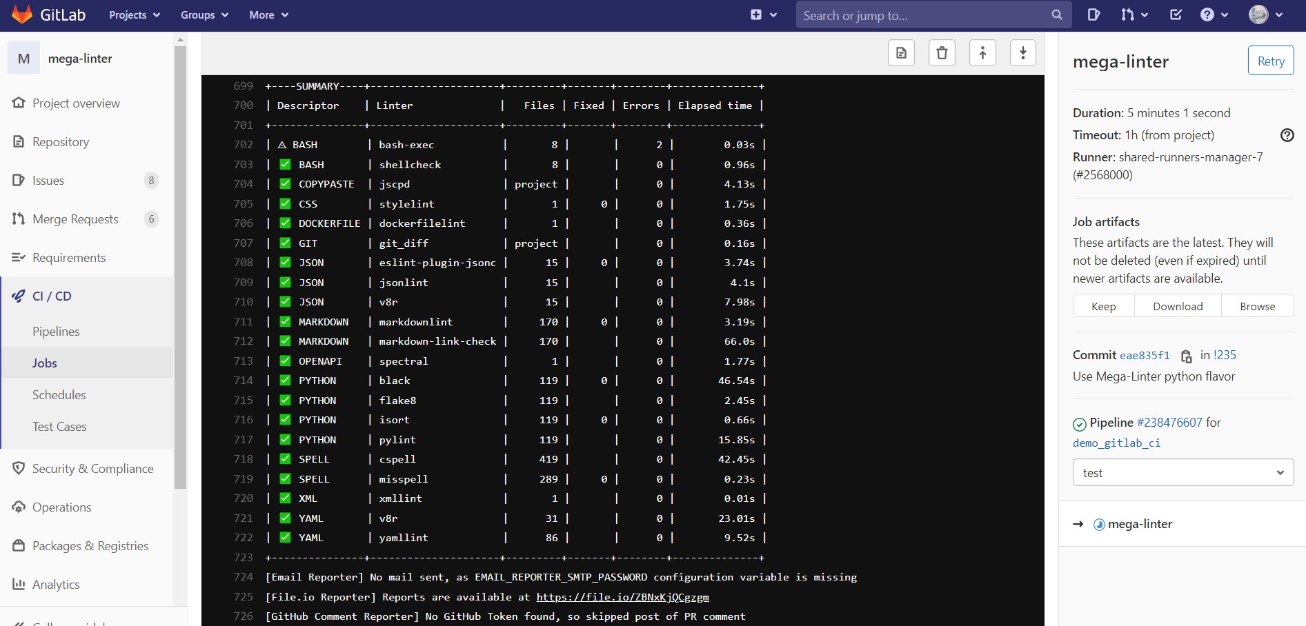 • You can export mega-linter.log and folder <WORKSPACE>/report as external artifacts